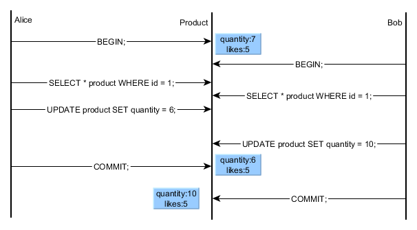 Alice의 변경 연산의 결과가 Bob의 연산에 의해 무효화됨.