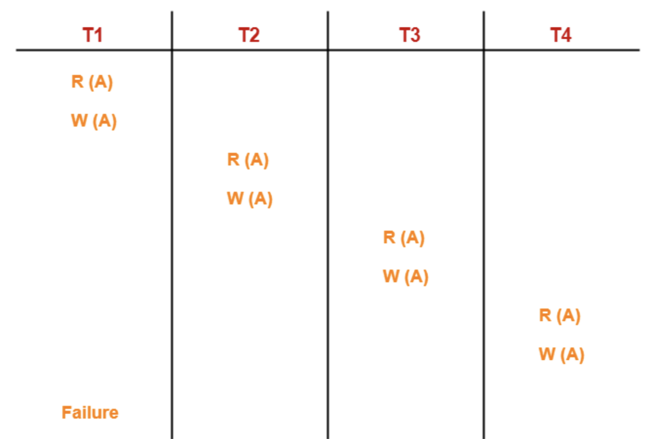 - T2의 연산의 경우 T1 연산에 의존적이고 연쇄적으로 T3 → T2, T4 → T3에 의존적.