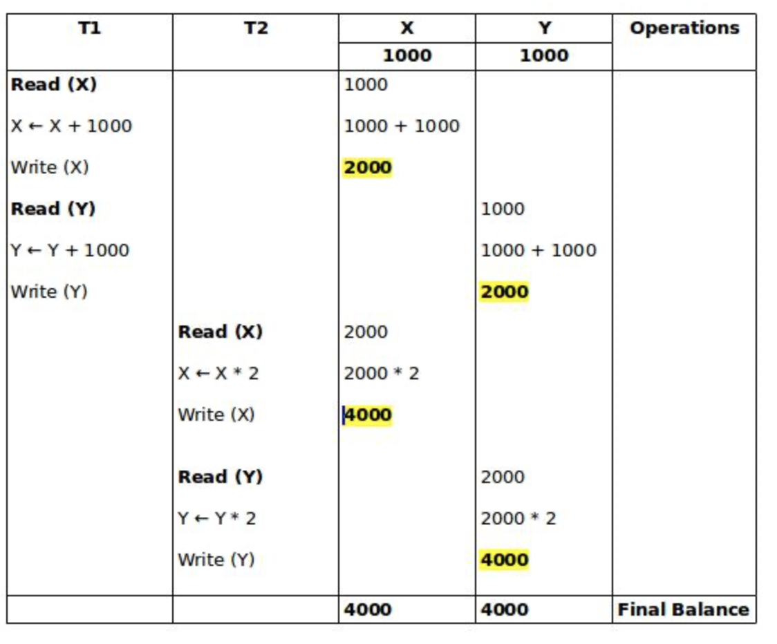 위 예시의 경우 T1의 연산이 모두 실행된 후 T2의 연산이 수행됨.