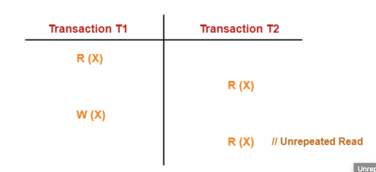 - T2가 다시 X 값을 조회 시 변경된 15가 조회됨.(원래는 X의 값이 조회 시 10이 나오기를 기대했으나, T1에서 변경 연산이 수행이 되어 모순된 결과가 나옴)