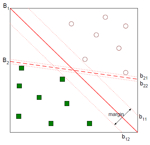 B1, B2선중에 머가 더 두개의 labe을 잘 나눈 선이라고 생각하는가??