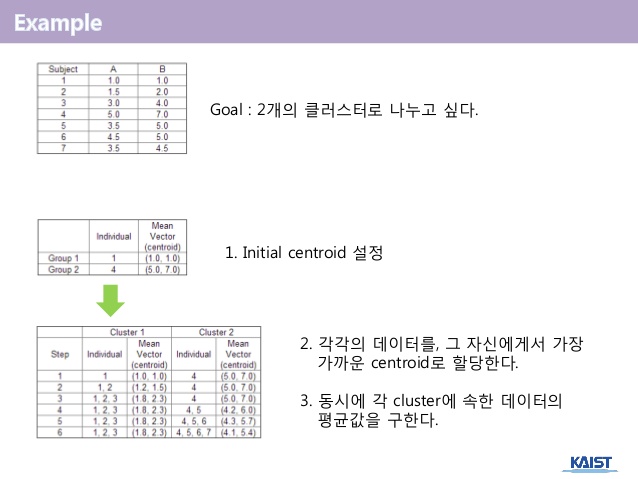 같은 중심에 할당된 개체들이 모여 하나의 군집을 형성한다.