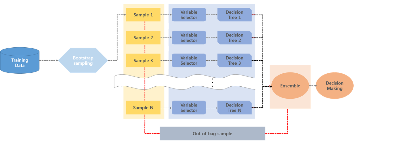 각 샘플링된 데이터 셋에서 임의의 변수를 선택하는 과정을 진행하고